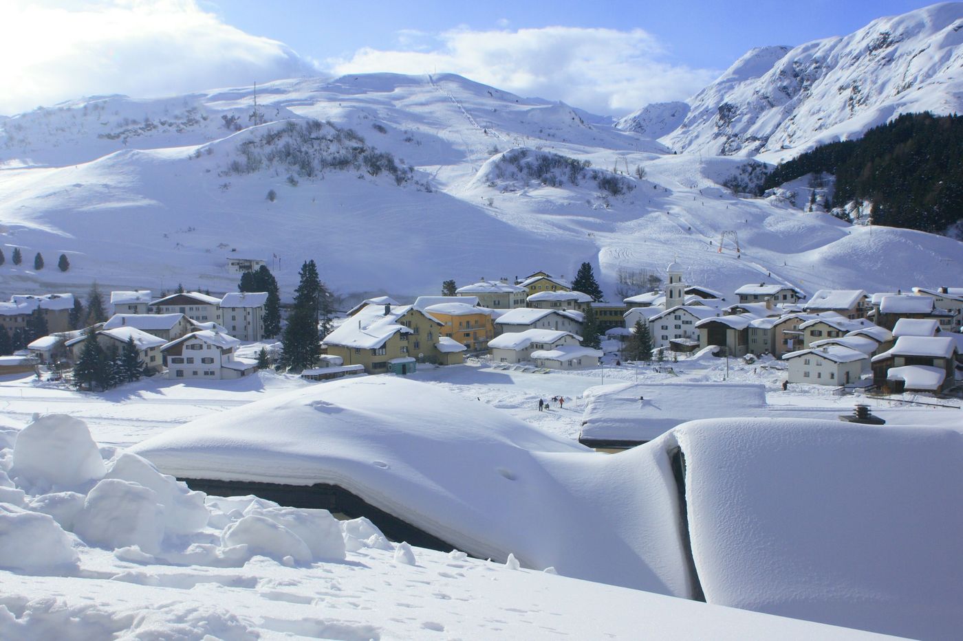 The village itself is completely quiet, there are just three hotels, a store and a decent ski shop. It is served by an ever reliable Postbus. Total transfer time on public transport from Zurich airport is about 3.5 hours.